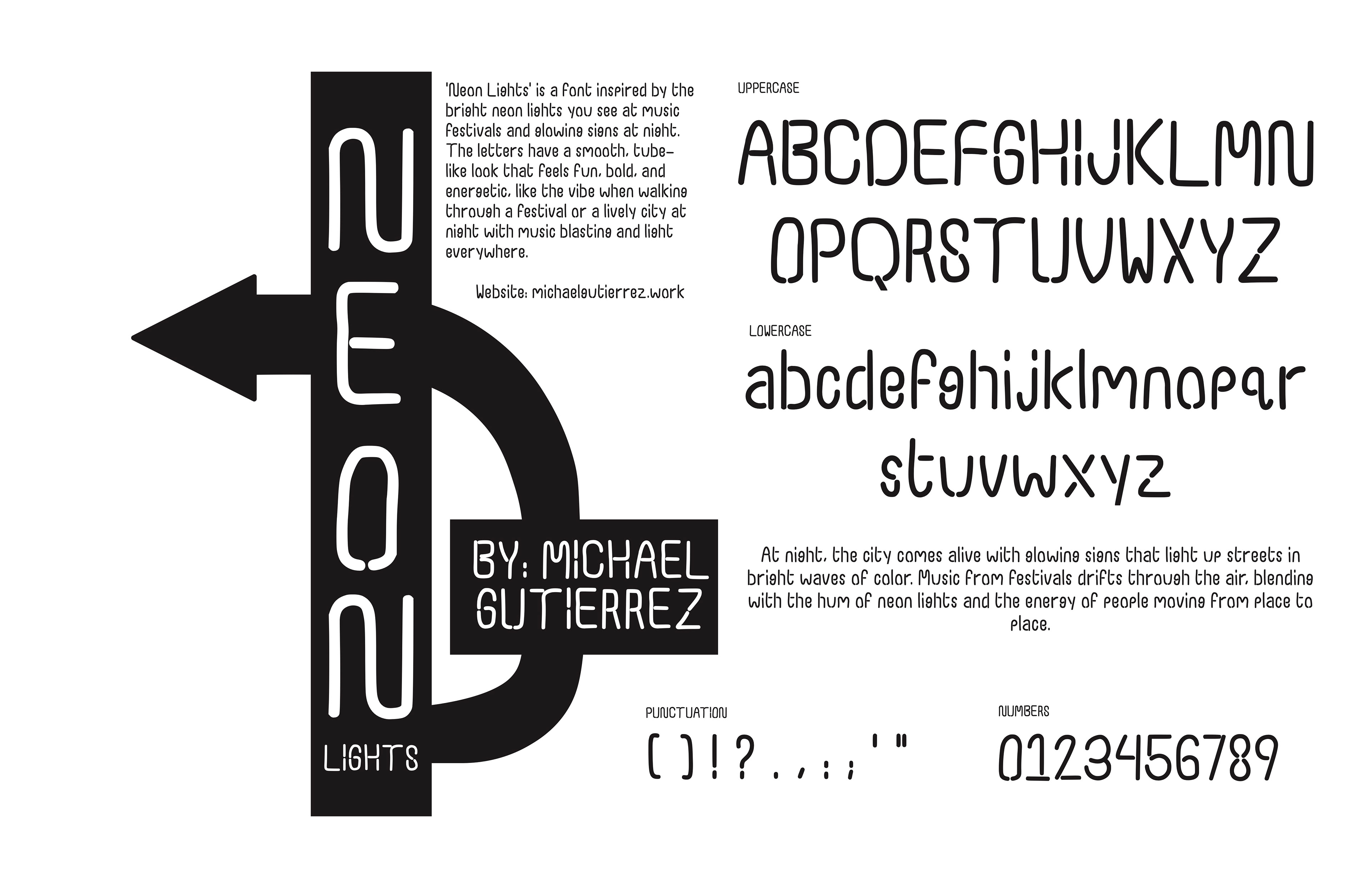 'Neon Lights' is a font inspired by the bright neon lights you see at music festivals and glowing signs at night. The letters have a smooth, tube-like look that feels fun, bold, and energetic, like the vibe when walking through a festival or a lively city at night with music blasting and light everywhere.